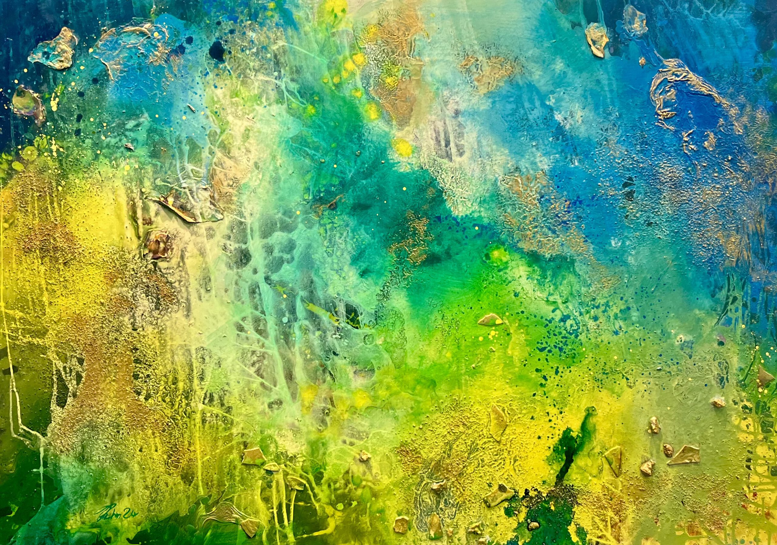 Erst wenn das Bild in Komposition und Farbaufteilung sowie in Power und Ruhe ausgeglichen ist und dabei genügend Spielraum für Phantasiegebilde lässt, ist es fertig.